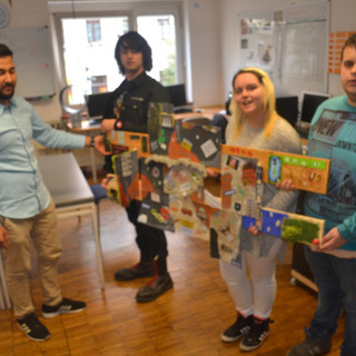 Angefangen haben wir damit, Detailaufnahmen von Häusern zu machen. Danach haben wir uns die besten Fotos heraus gesucht und haben sie bearbeitet, zum Beispiel haben wir aus einer Straßenbahnhaltestelle mit Photoshop eine Schnitzelhaltestelle gemacht. Unsere selbstgemachte Collage hat mehrere Ebenen. Der Hintergrund besteht aus einer selbst gebastelten Mauer aus Karton. Um die Oberfläche einer Mauer nachzustellen haben wir die Küchenrolle mit Bastelkleber auf die Mauer geklebt und das Ganze anschließend mit Acrylfarbe in den passenden Farben und Muster bemalt. Das Endergebnis hat ausgesehen wie eine echte Mauer. Auf den Karton haben wir die fertig bearbeiteten Bilder aufgeklebt.